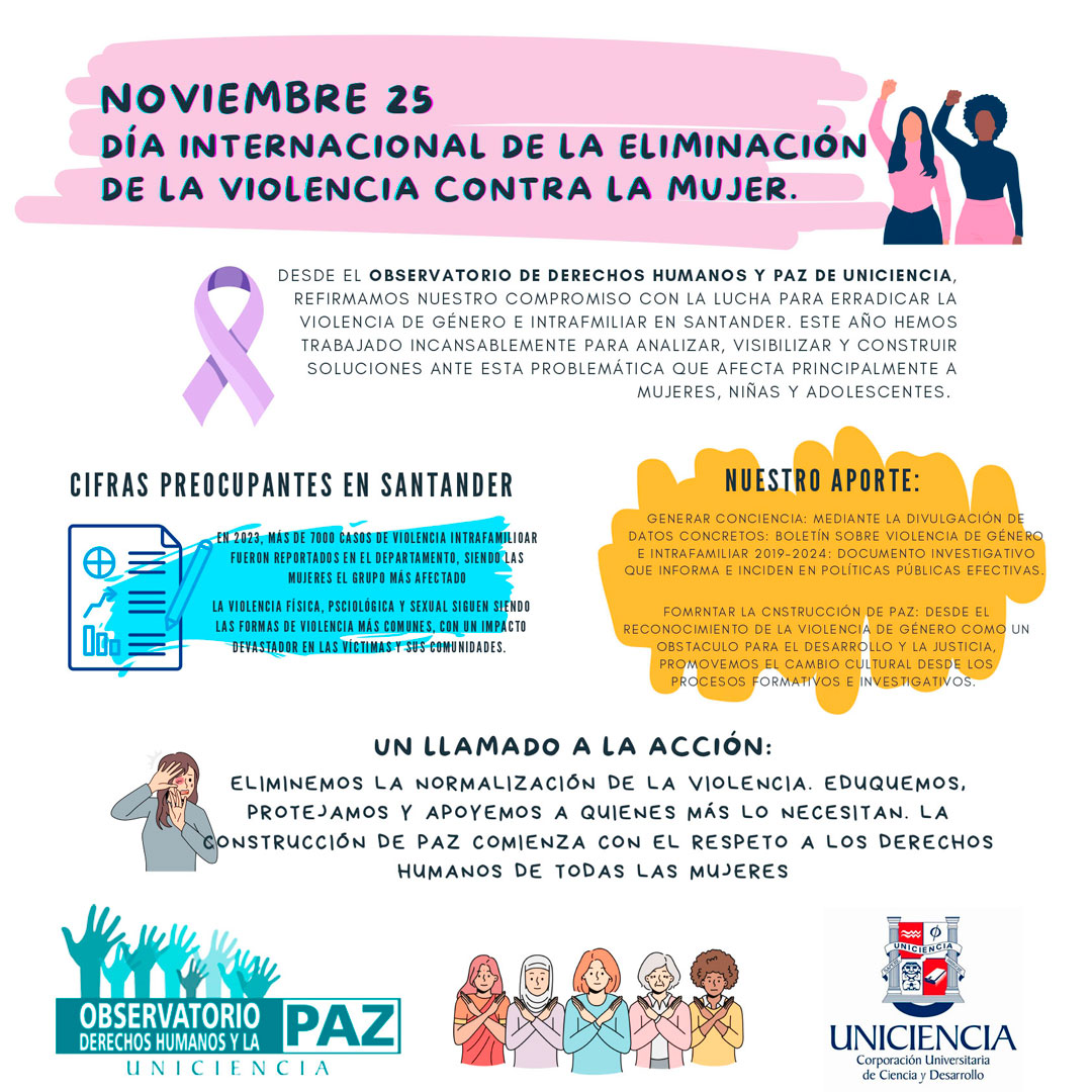 Hoy, 25 de noviembre, en el marco del Día Internacional de la Eliminación de la Violencia contra la Mujer, el Observatorio de Derechos Humanos y Paz de UNICIENCIA reafirma su compromiso con la lucha por los derechos de las mujeres y contra la violencia de género e intrafamiliar. En este periodo académico, el Observatorio ha liderado un trabajo exhaustivo enfocado en visibilizar, analizar y proponer soluciones a esta problemática en Santander, generando un impacto significativo en la comunidad académica y social, siendo voceros de este tema en el Red Nacional de Observatorios de Derechos Humanos - RODHI nodo Santander.